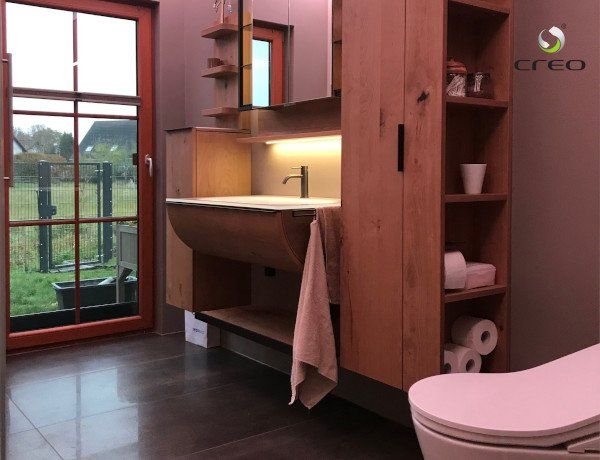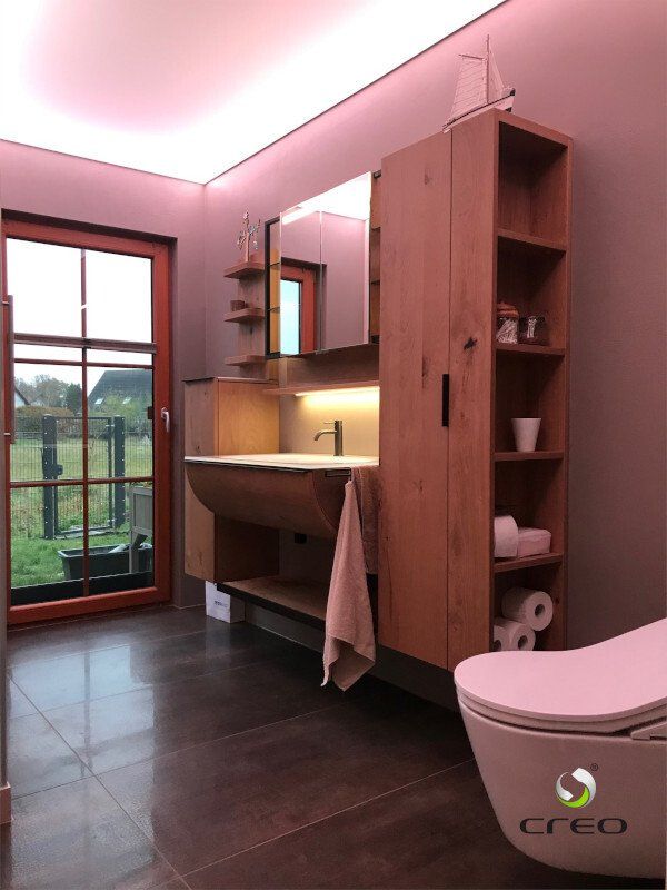 Während der Planung entwickelten wir zuerst eine optimale Raumstruktur, die es ermöglicht die gewünschte Badewanne und eine große ebenerdige Dusche zu integrieren, den Raum aber trotzdem großzügig, modern und klar wirken zu lassen. Nachdem die Raumaufteilung klar war, ging es an die Bemusterung von Farben und Badobjekten. Ziel war eine klare moderne Struktur mit warmen Holzelementen zu verbinden, um ein echtes Wohlfühlbad zu entwickeln. Bei der Badausstattung fiel die Wahl auf eine Badewanne von repaBAD, die Eckvariante der freistehenden Livorno Badewanne, mit einer Wannenrandarmatur von FIMA Carlo Frattini, einem familiengeführten italienischen Armaturenhersteller. Die Serie Spillo Tech zeichnet sich durch eine Mischung aus klarer, reduzierter Formensprache in Kombination mit Griffen, die eine Musterprägung haben und das einfallende Licht sehr schön reflektieren.